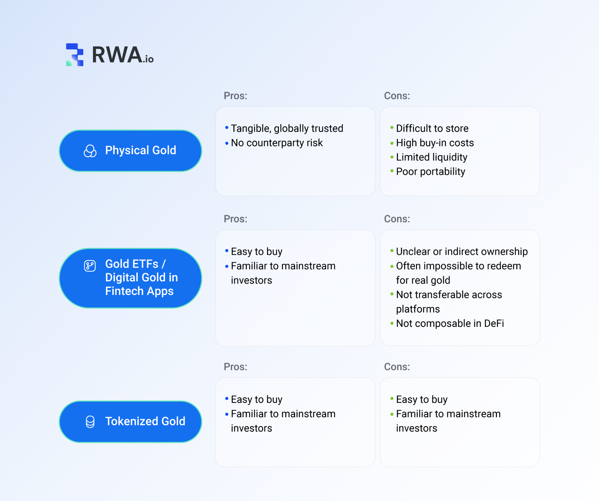 This question highlights the practical constraints that physical gold and ETFs still impose on everyday investors. Tokenized gold approaches these challenges differently. Here’s how it compares across traditional and digital formats: